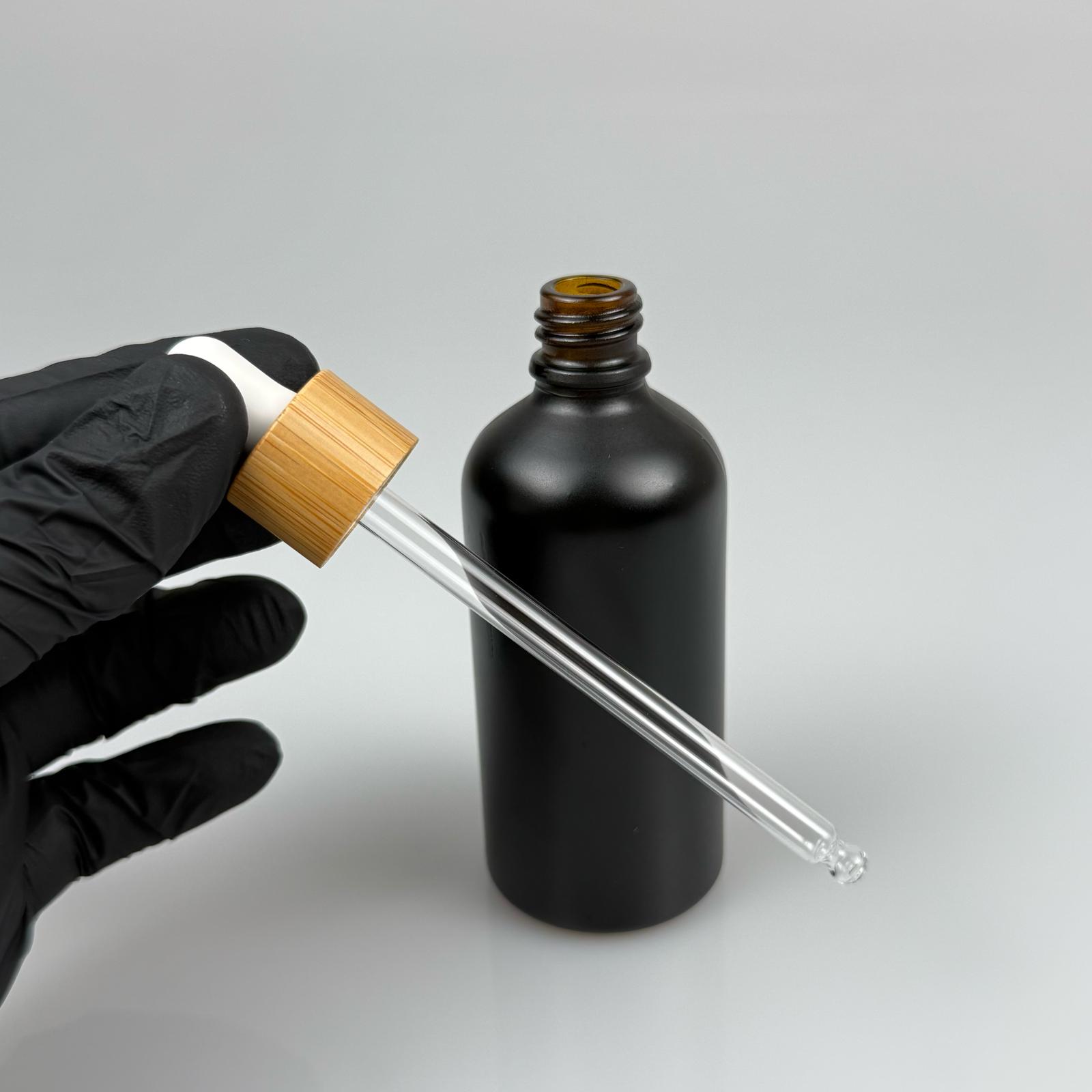 100 CC MAT SİYAH CAM DAMLALIKLI ŞİŞE - BEYAZ EMZİK - BAMBU AHŞAP KAPAK - 100 ML BAMBU KAPAKLI CAM DAMLALIKLI ŞİŞE
