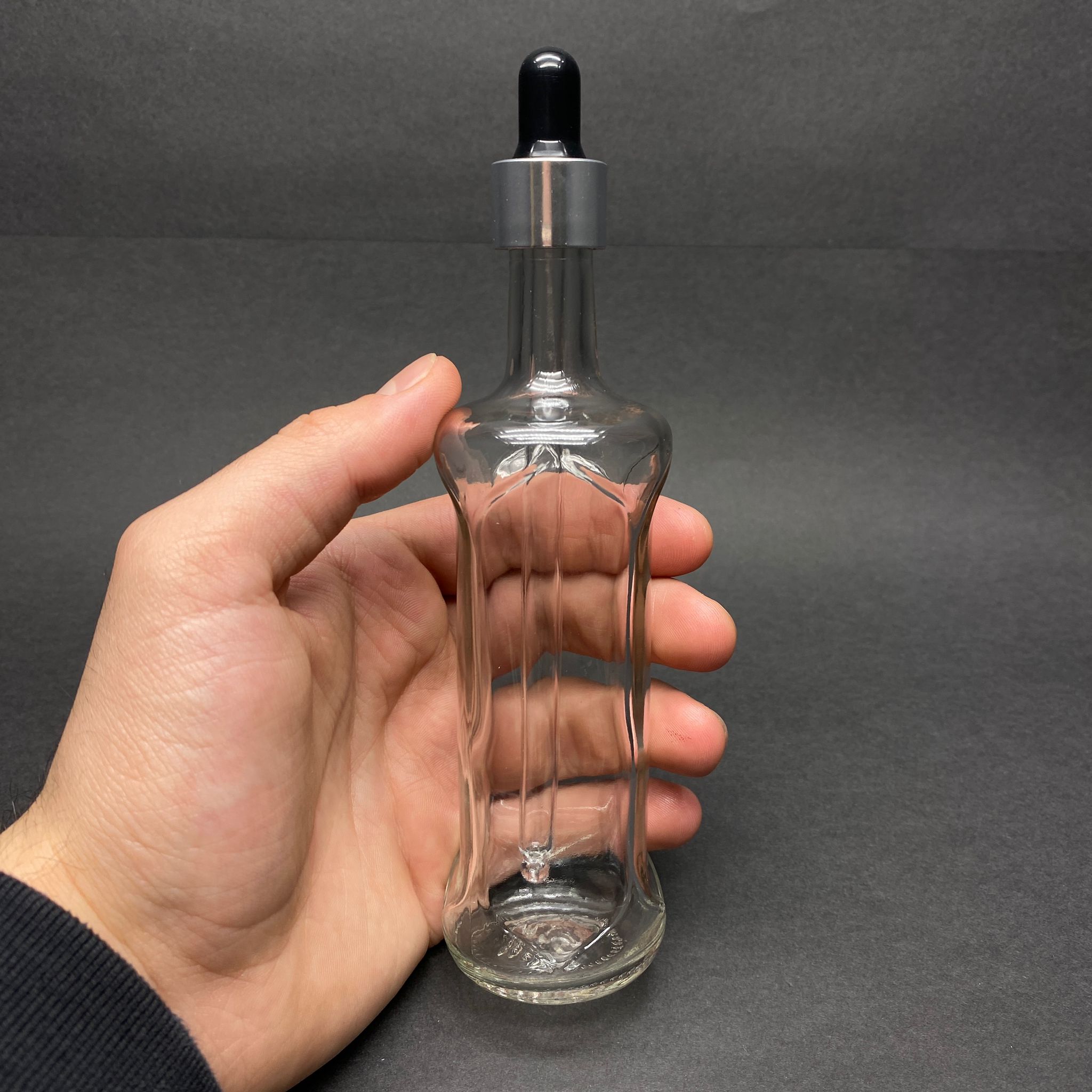 100 CC ŞEFFAF CAM DAMLALIKLI ŞİŞE DORİKA MODEL - SİYAH EMZİK - GÜMÜŞ METAL KAPAK - 100 ML SAYDAM CAM DAMLALIKLI ŞİŞE