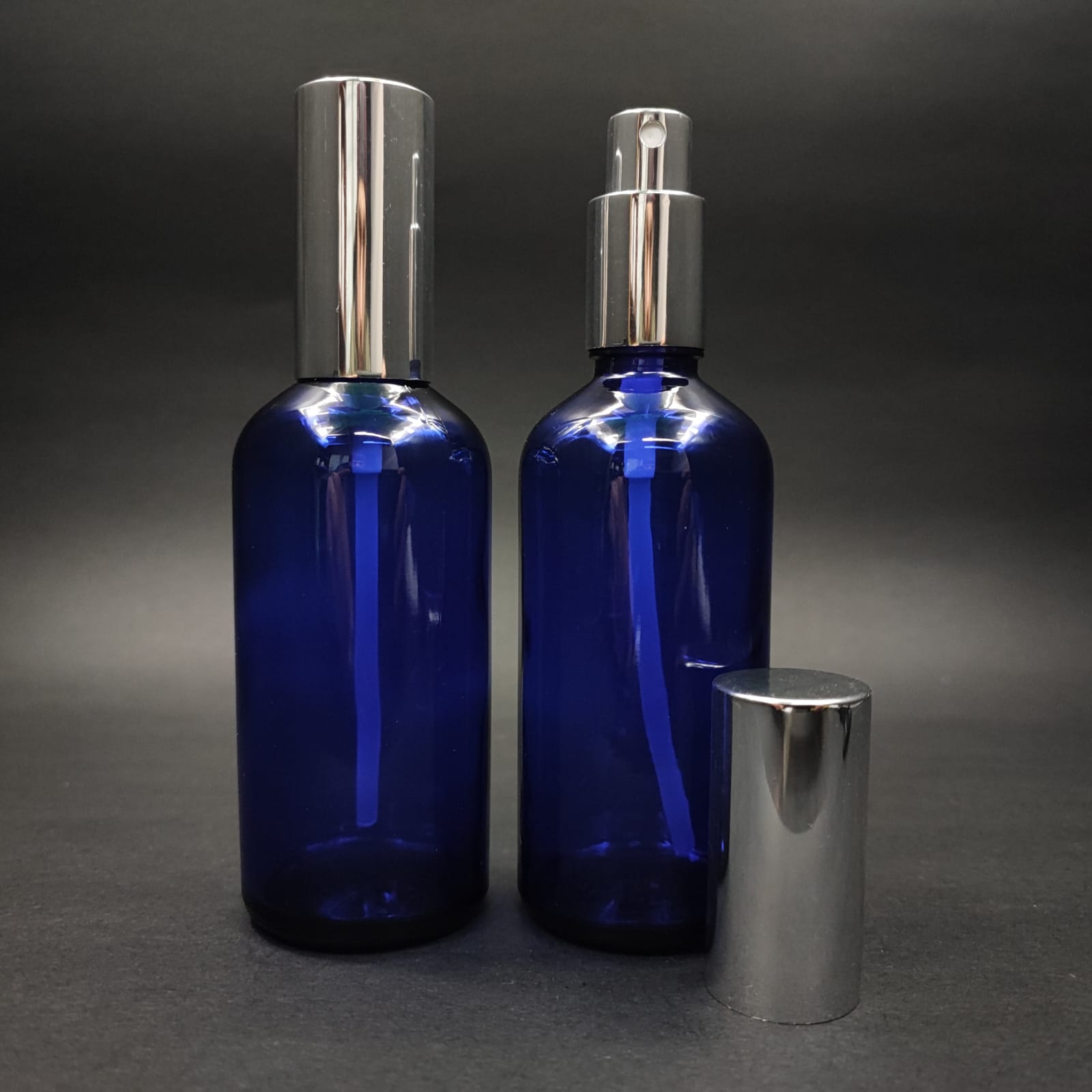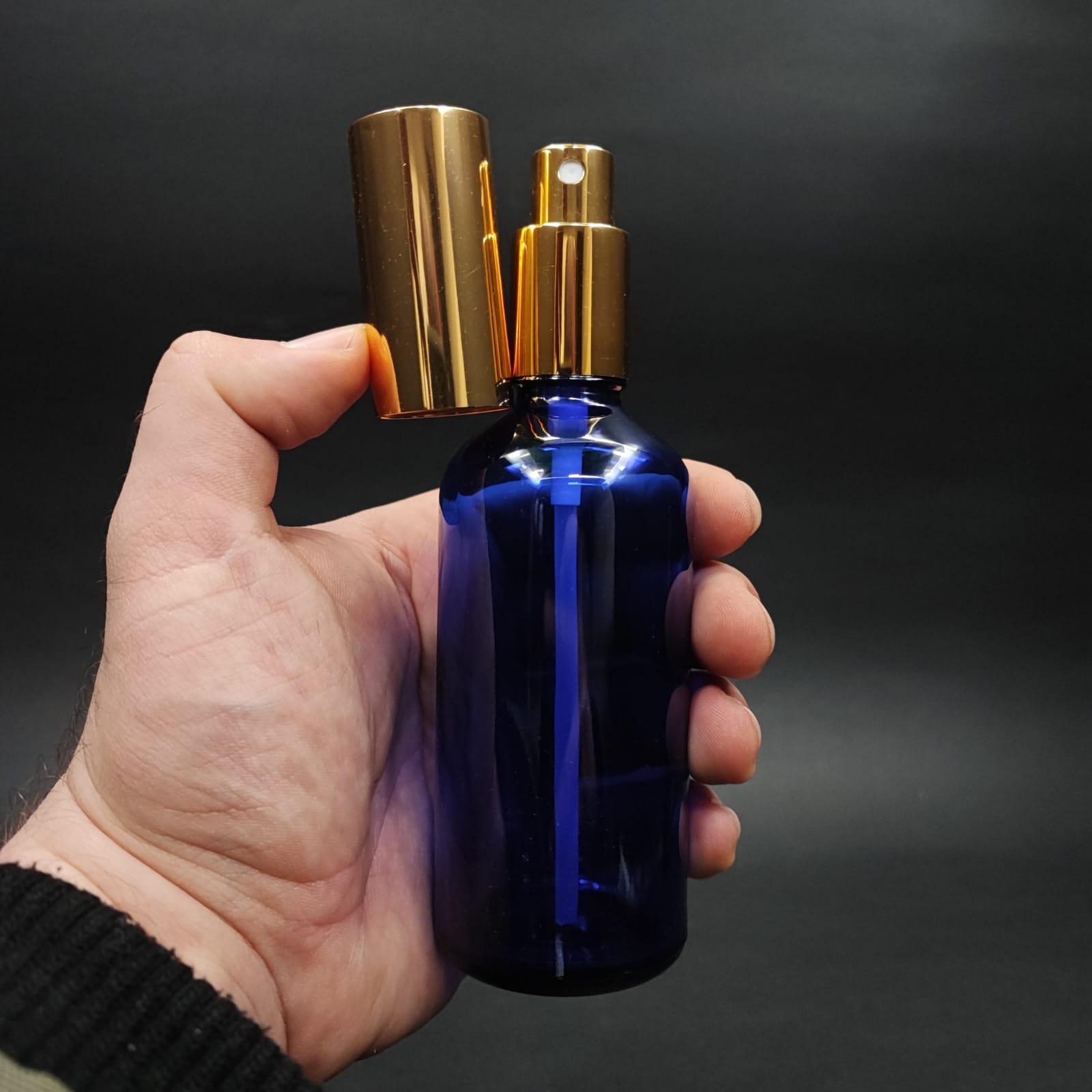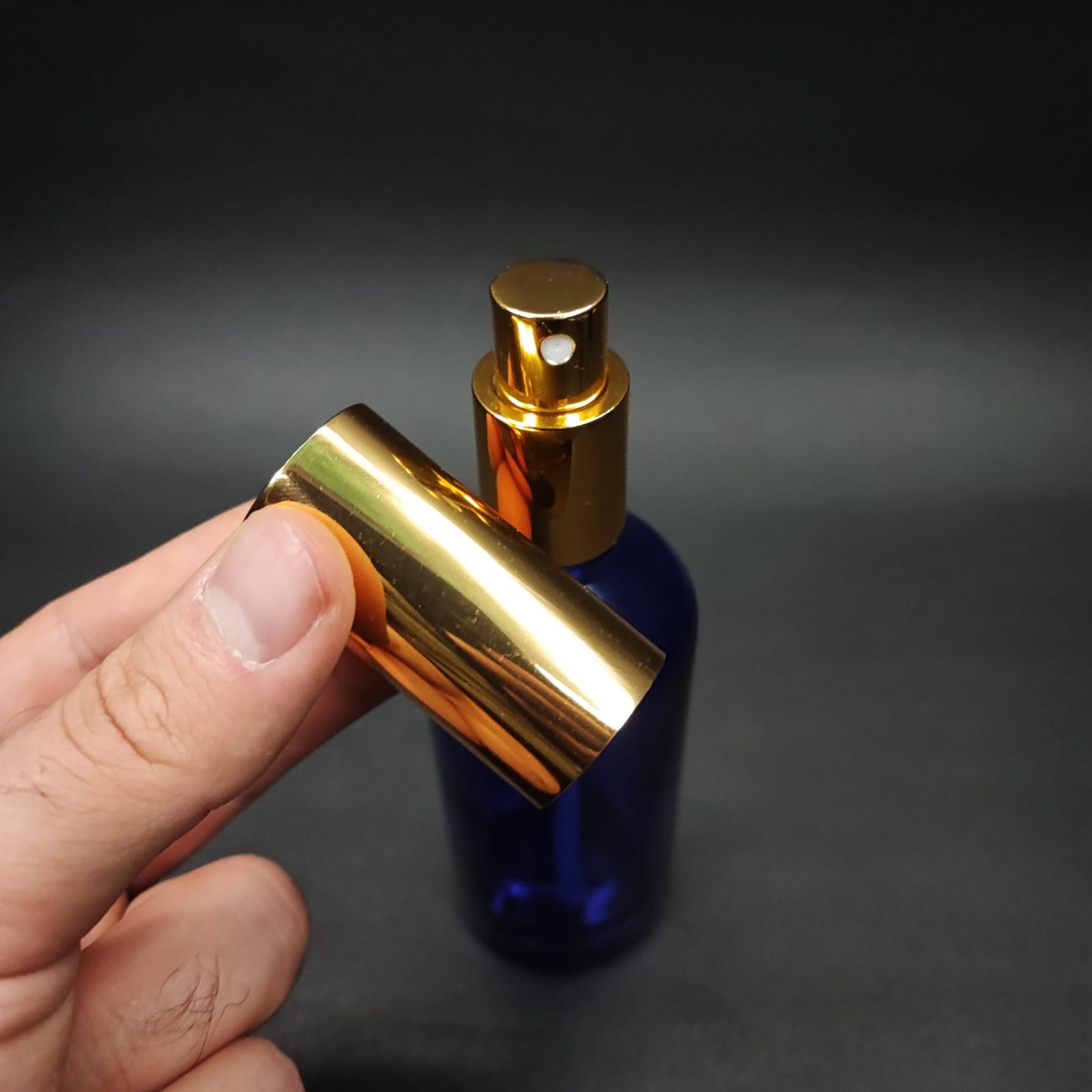 100 ML LÜKS VİDALI VALF ÇEVİRME PARFÜM ŞİŞELERİ - 100 CC MAVİ CAM ŞİŞE - GOLD METAL SPREYLİ KAPAKLI SET