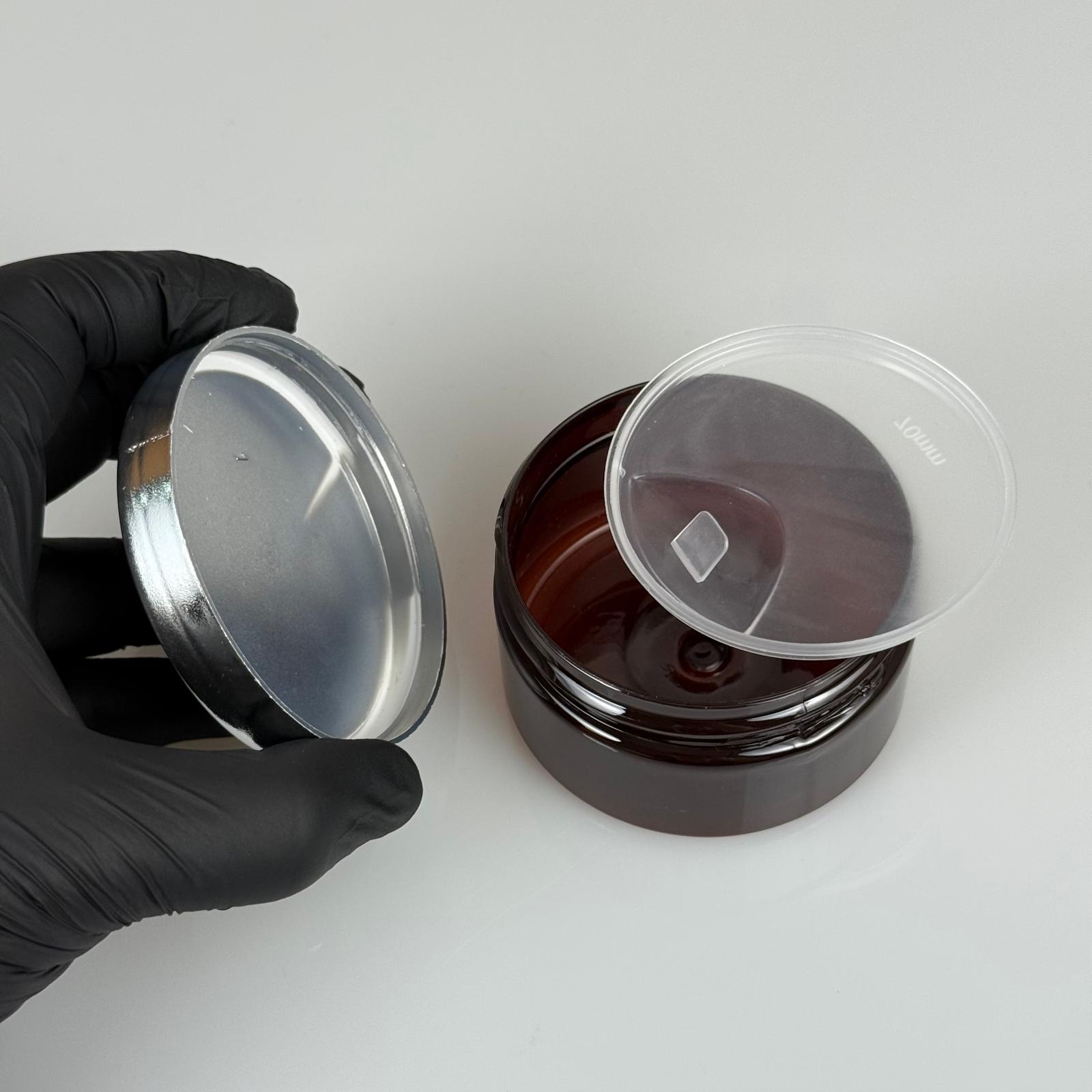 100 ML SERT PET KAVANOZ + GÜMÜŞ KAPLAMALI PLASTİK KAPAK + İÇ TIPA - 100 CC KALIN AMBER PLASTİK KAVANOZ GÜMÜŞ KAPLAMALI PLASTİK KAPAKLI İÇ TIPALI TAKIM - KREM KAVANOZLARI