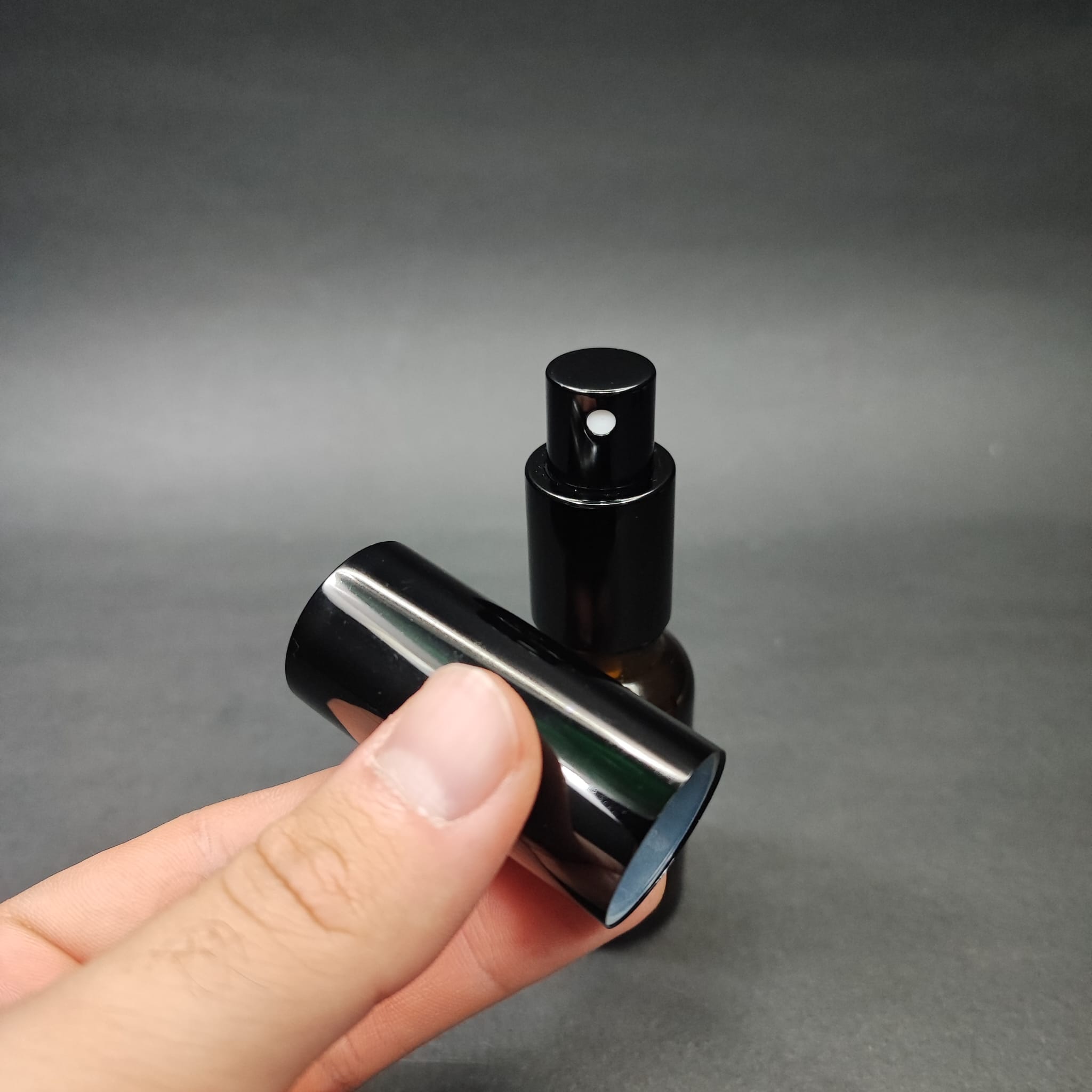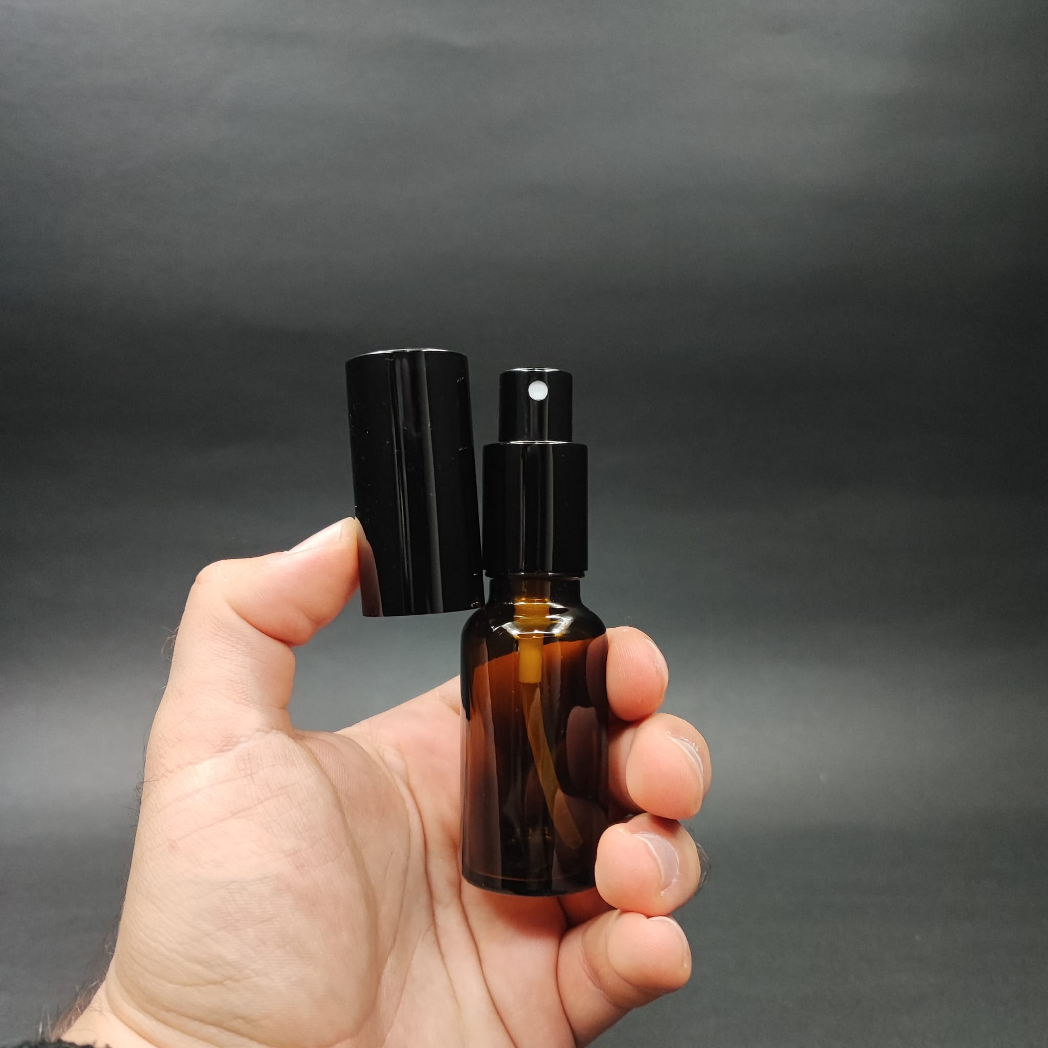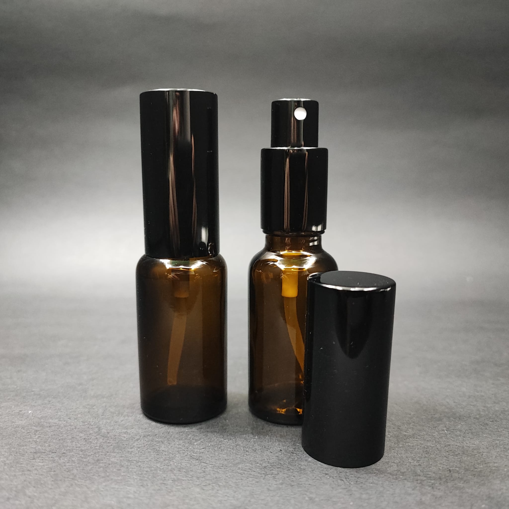 20 ML LÜKS VİDALI VALF ÇEVİRME PARFÜM ŞİŞELERİ - 20 CC AMBER CAM ŞİŞE - SİYAH METAL SPREYLİ KAPAKLI SET