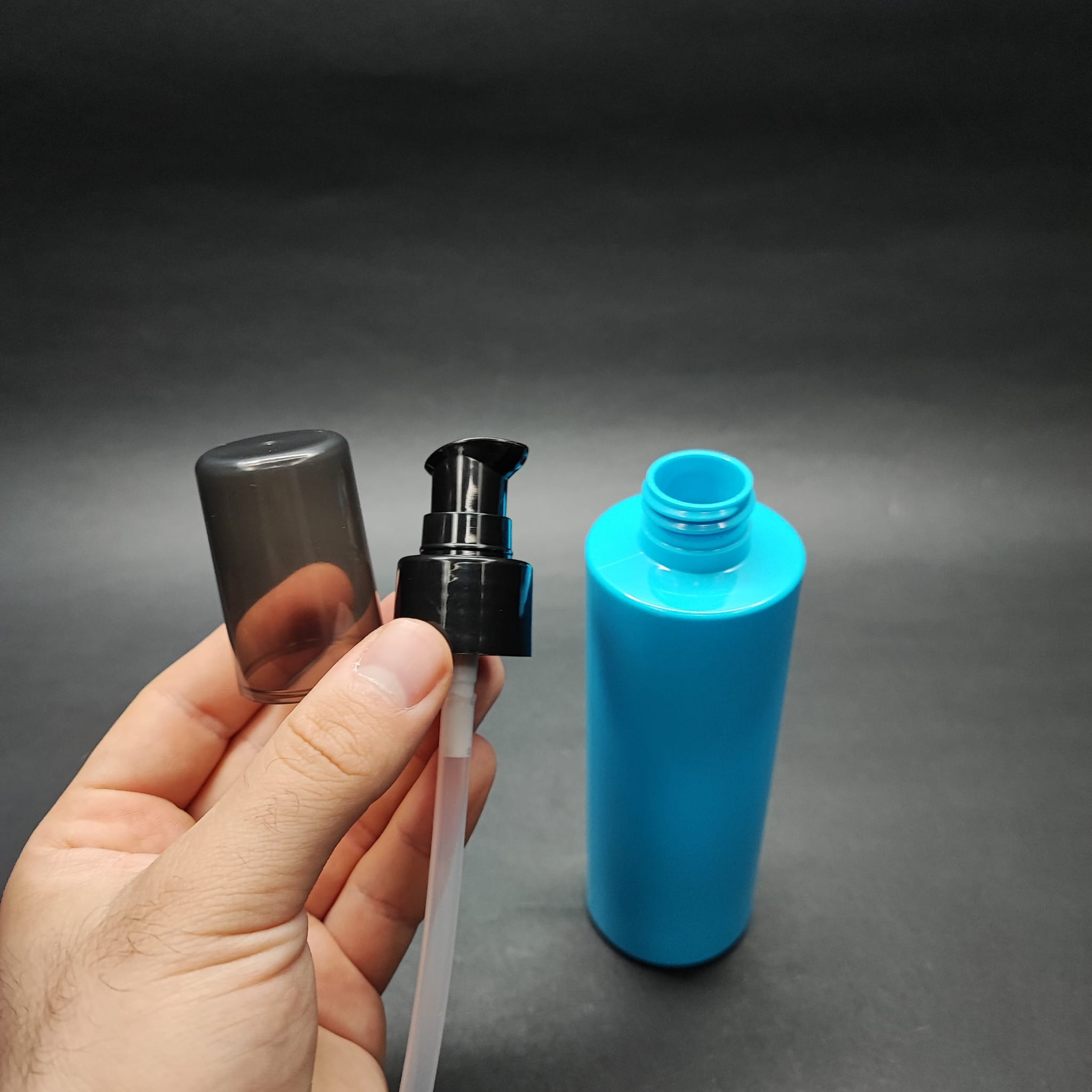 200 CC KÜT BOYUNLU UZUN SİLİNDİR PET ŞİŞE (24 GR) - SİYAH LOSYON POMPALI - 200 ML PLASTİK ŞİŞE - MAVİ