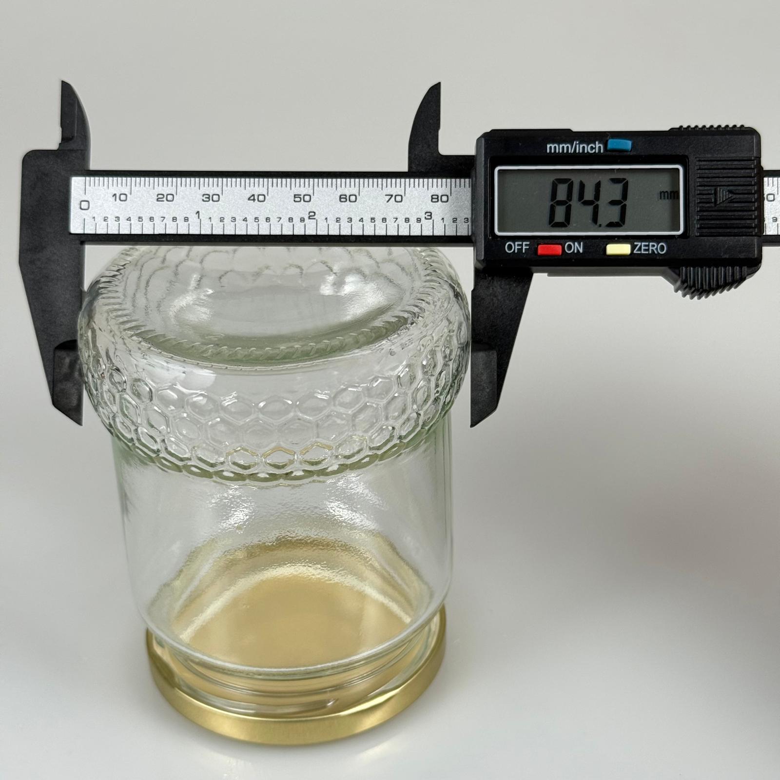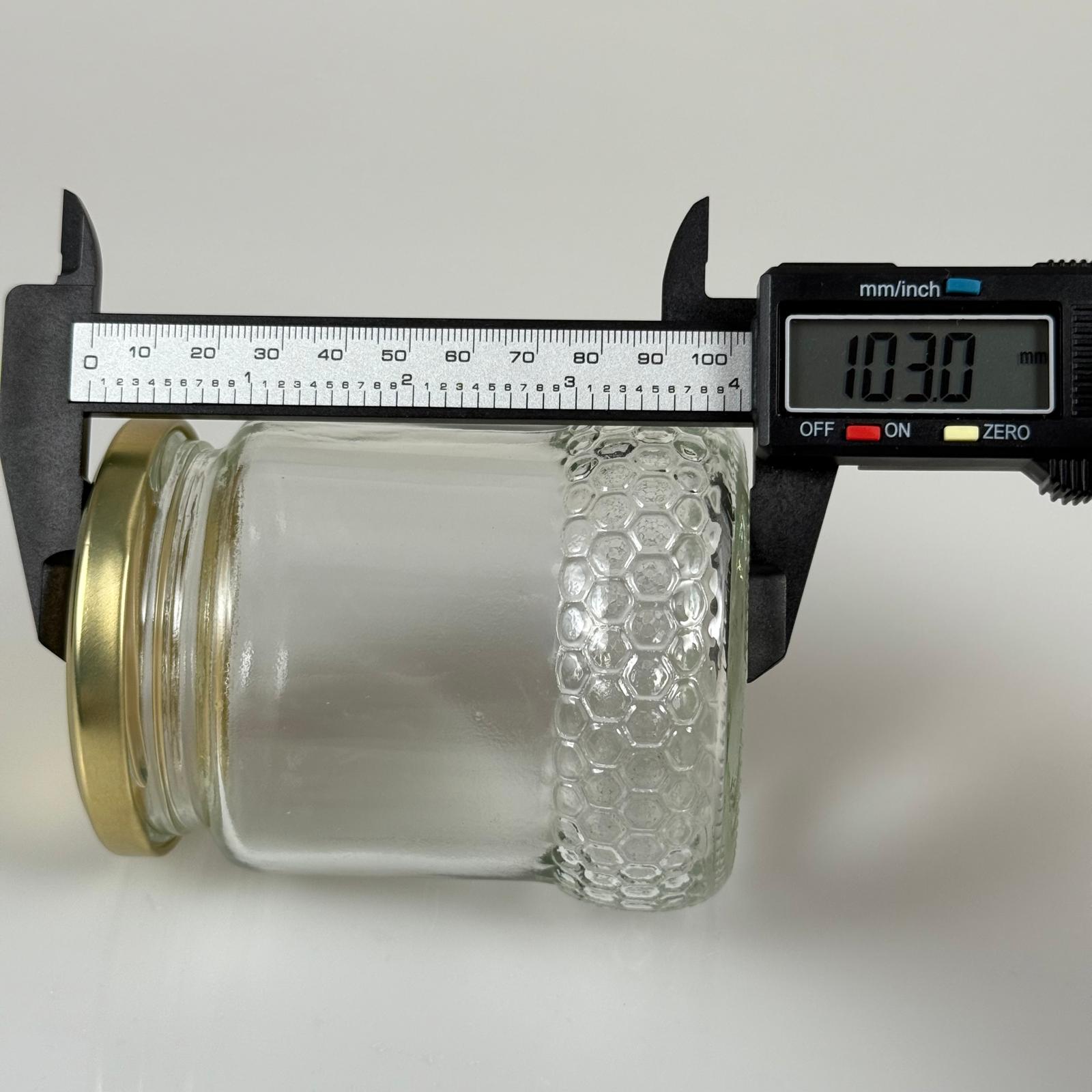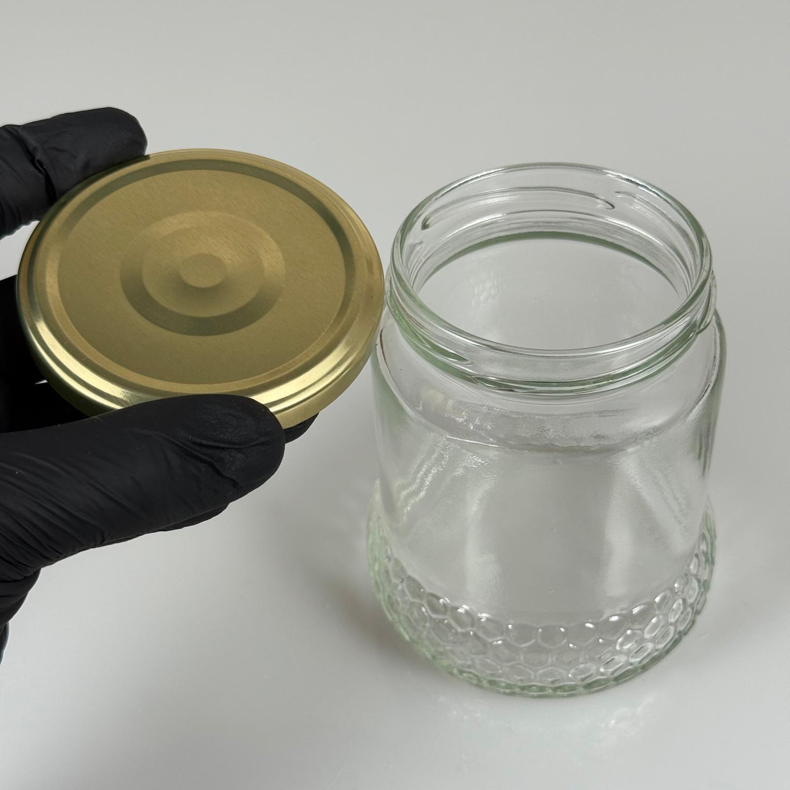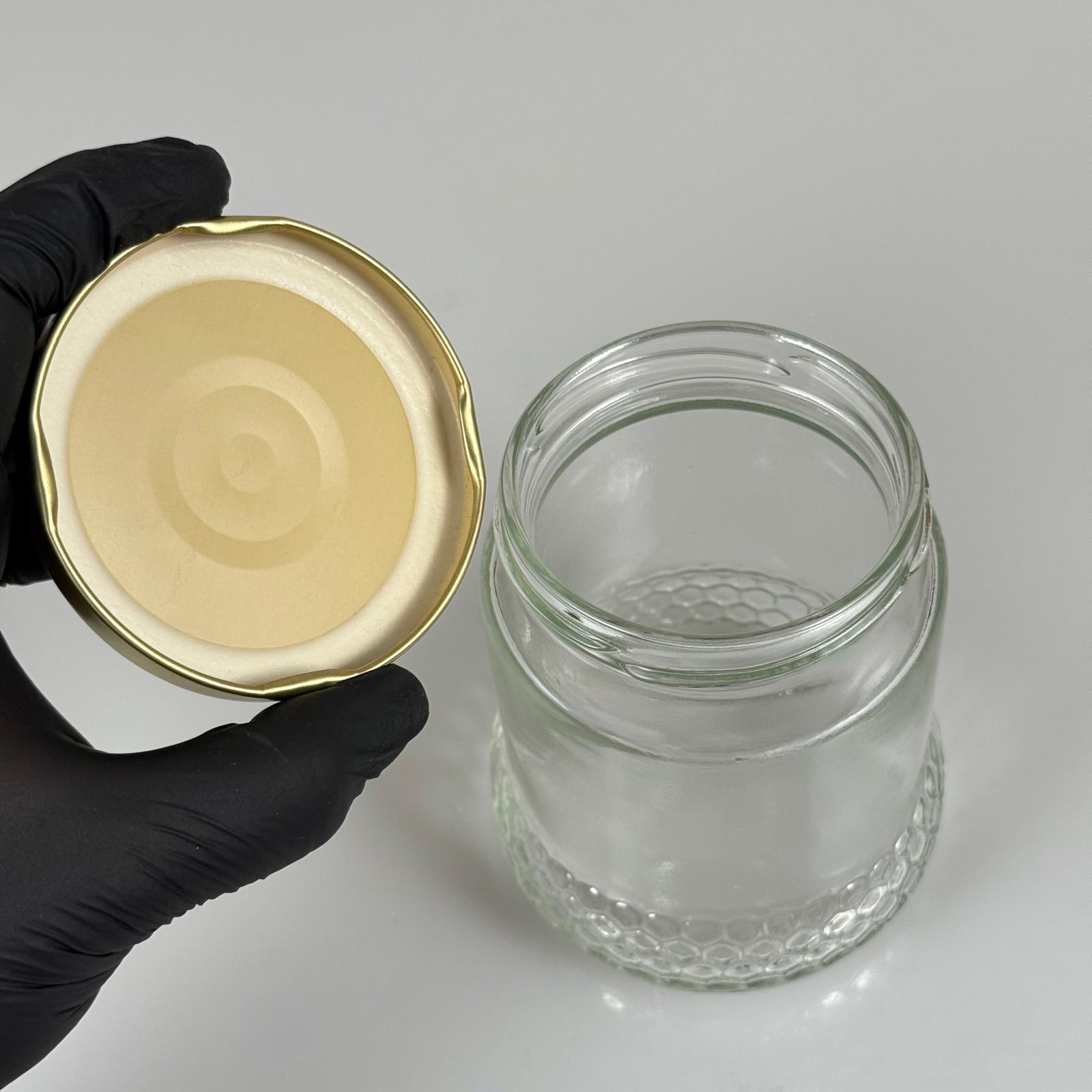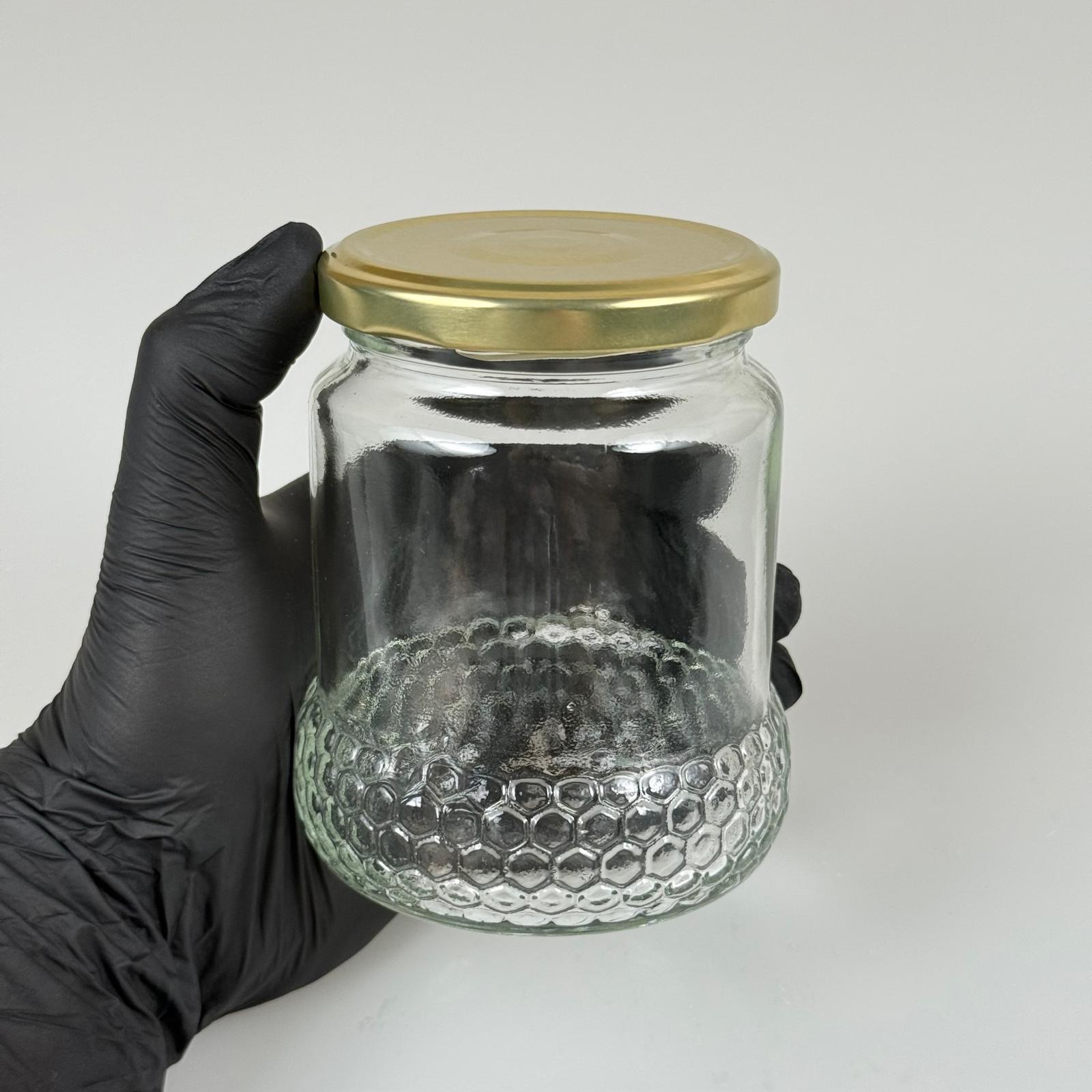 370 CC ÖZEL PETEK ŞEKLİNDE CAM BAL KAVANOZU + GOLD METAL KAPAK