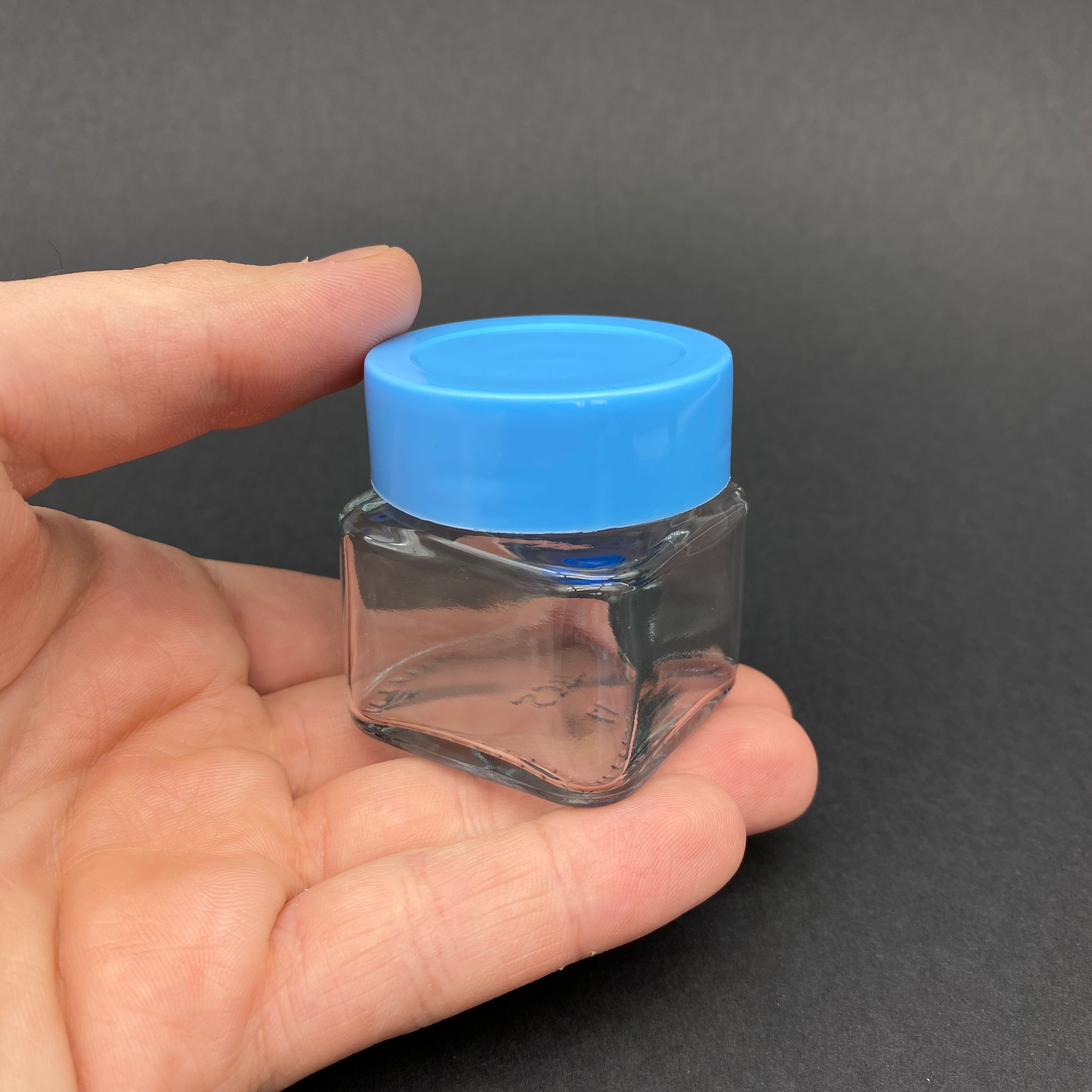 40 CC KARE KAVANOZ - MAVİ PLASTİK KAPAKLI - 40 ML KÖŞELİ TİP CAM KAVANOZ