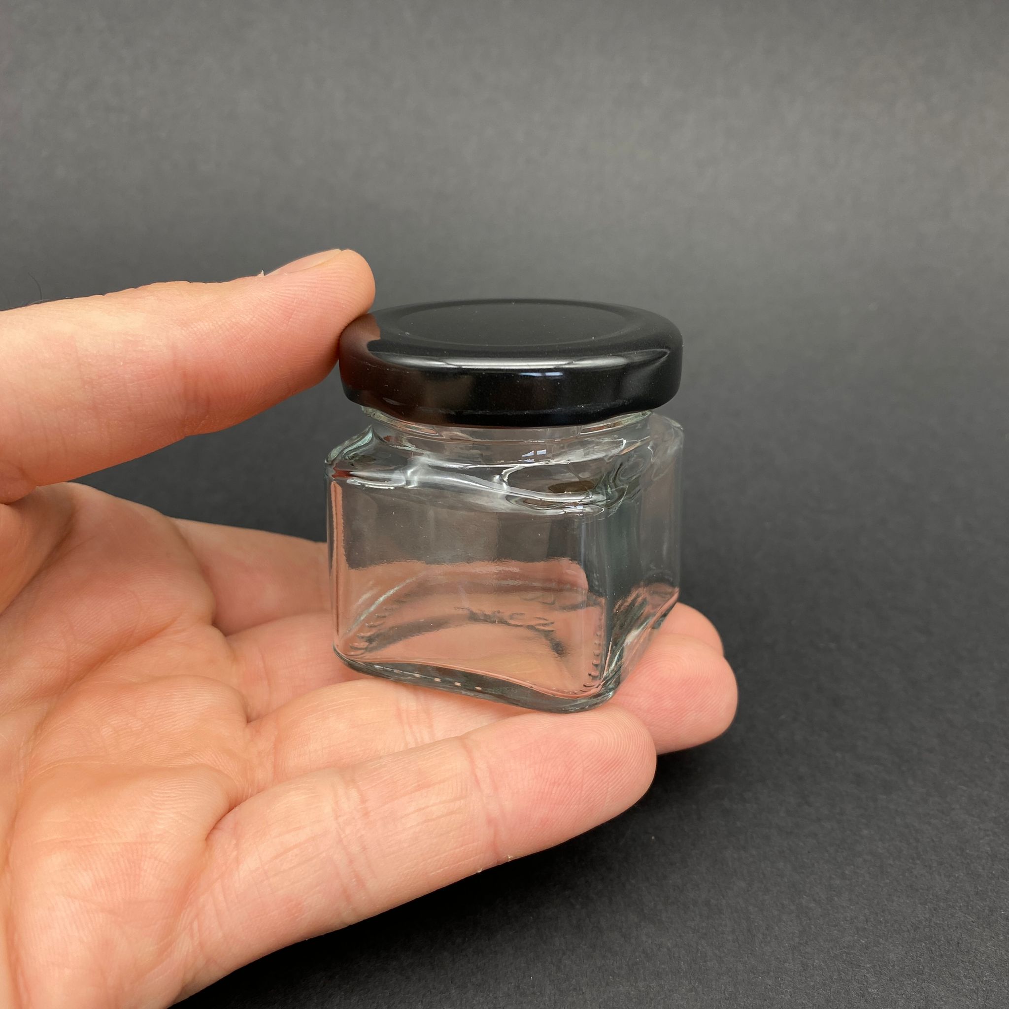40 CC KARE KAVANOZ - SİYAH METAL KAPAKLI - 40 ML KÖŞELİ TİP CAM KAVANOZ