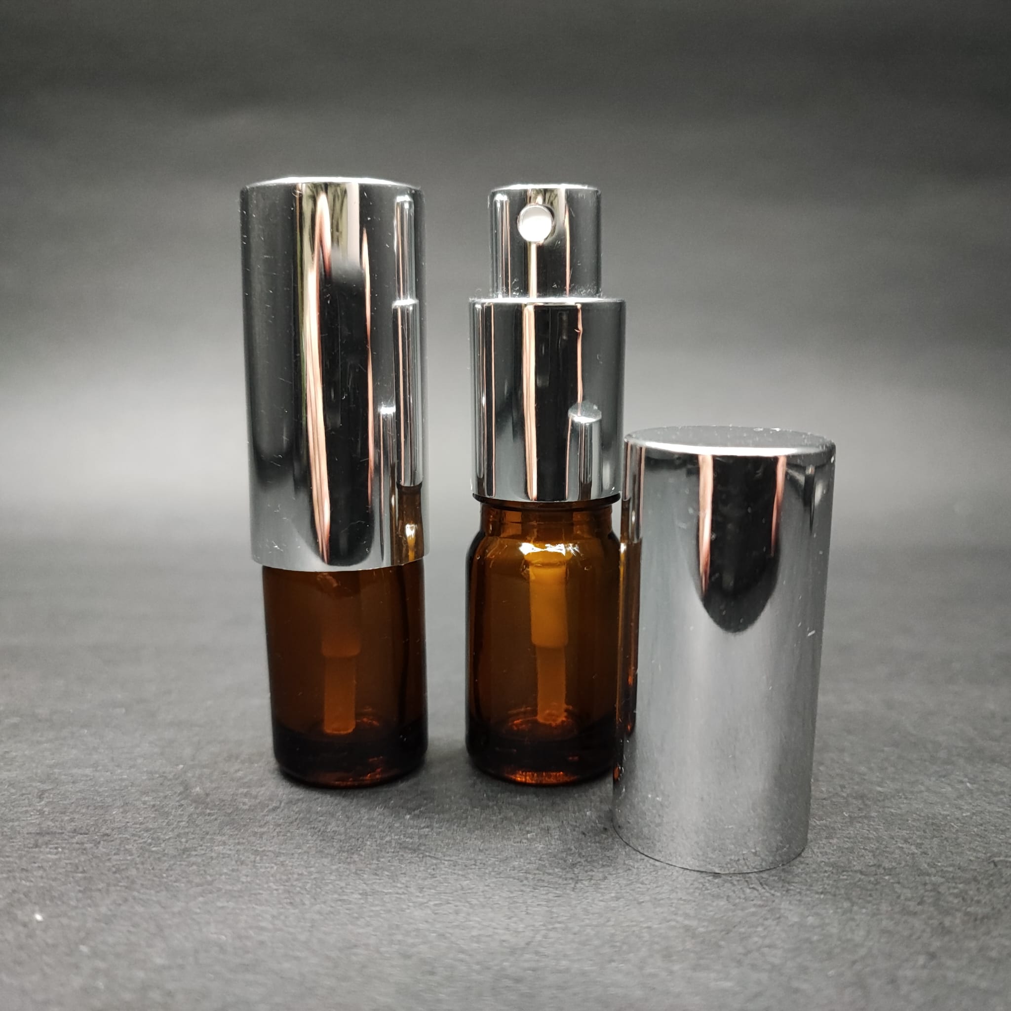 5 ML LÜKS VİDALI VALF ÇEVİRME PARFÜM ŞİŞELERİ - 5 CC AMBER CAM ŞİŞE - GÜMÜŞ METAL SPREYLİ KAPAKLI SET