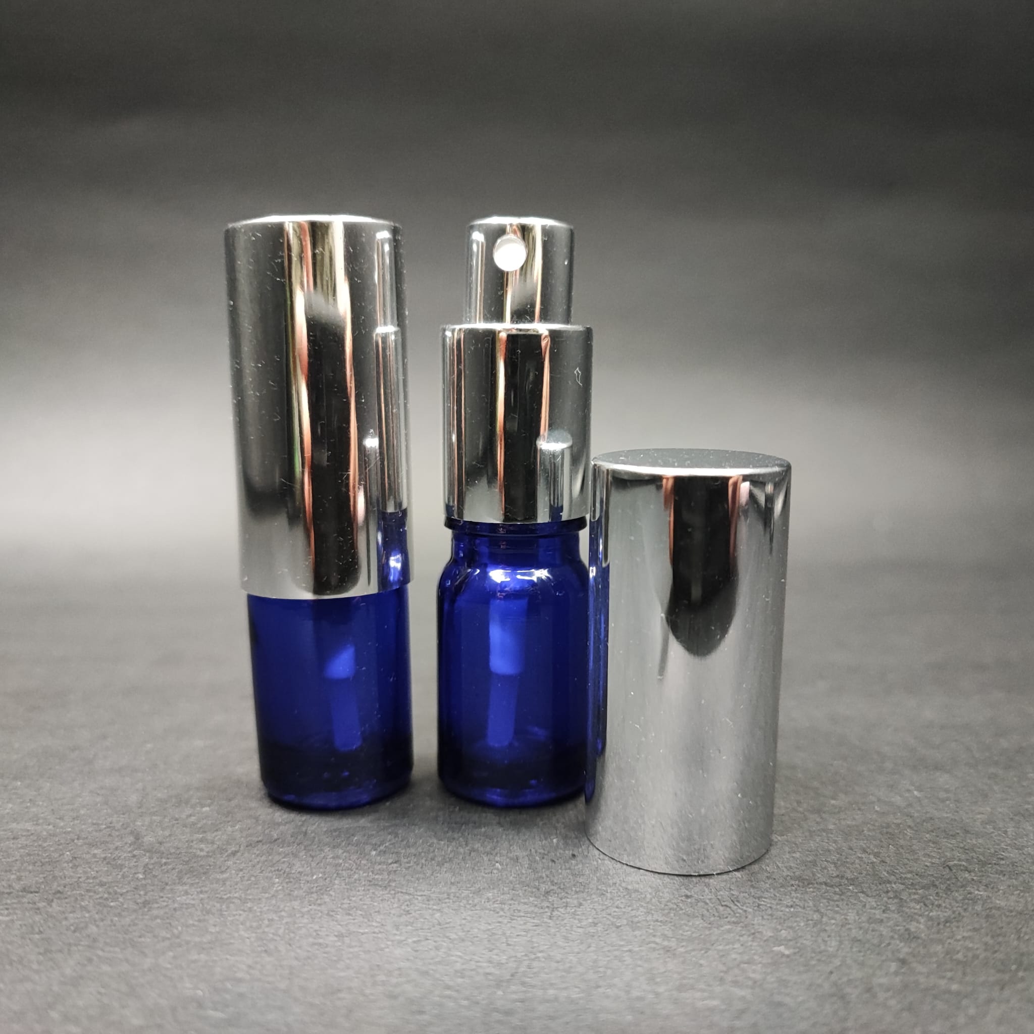 5 ML LÜKS VİDALI VALF ÇEVİRME PARFÜM ŞİŞELERİ - 5 CC MAVİ CAM ŞİŞE - GÜMÜŞ METAL SPREYLİ KAPAKLI SET