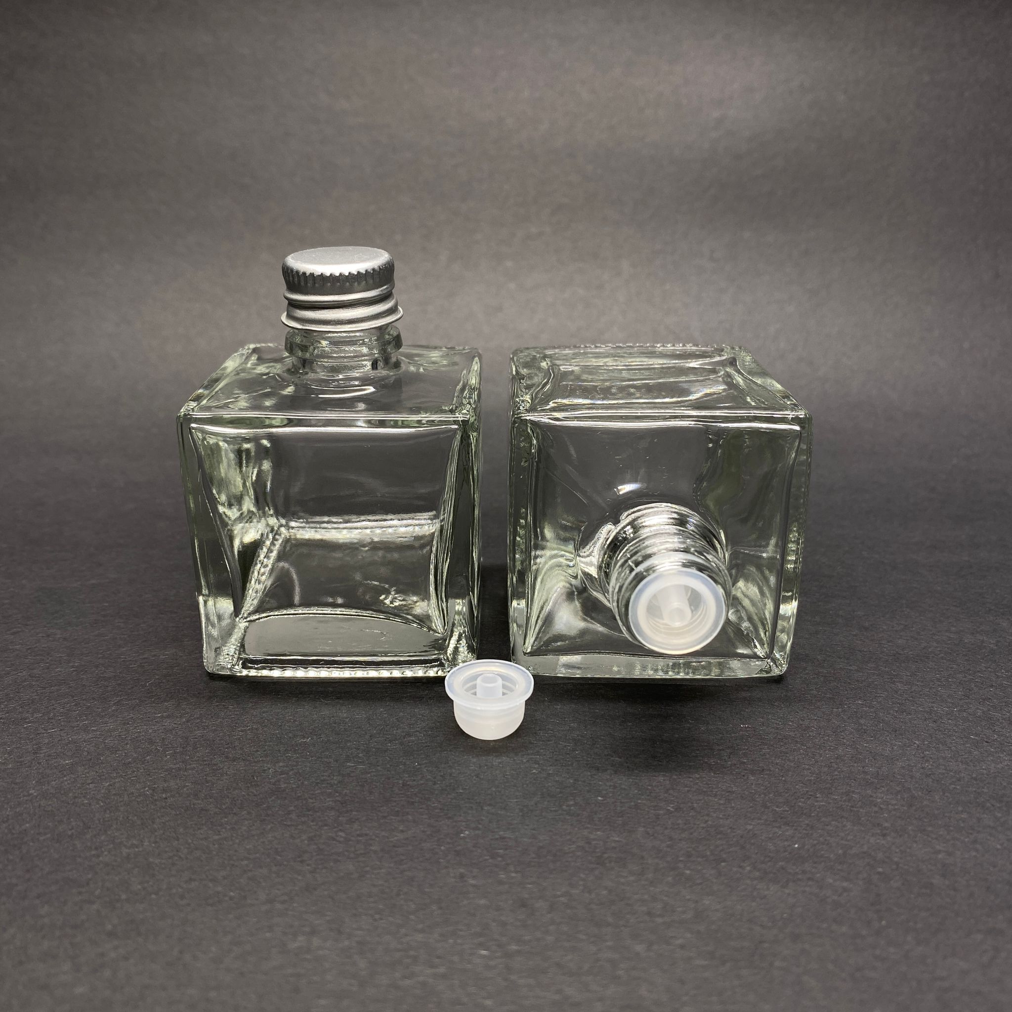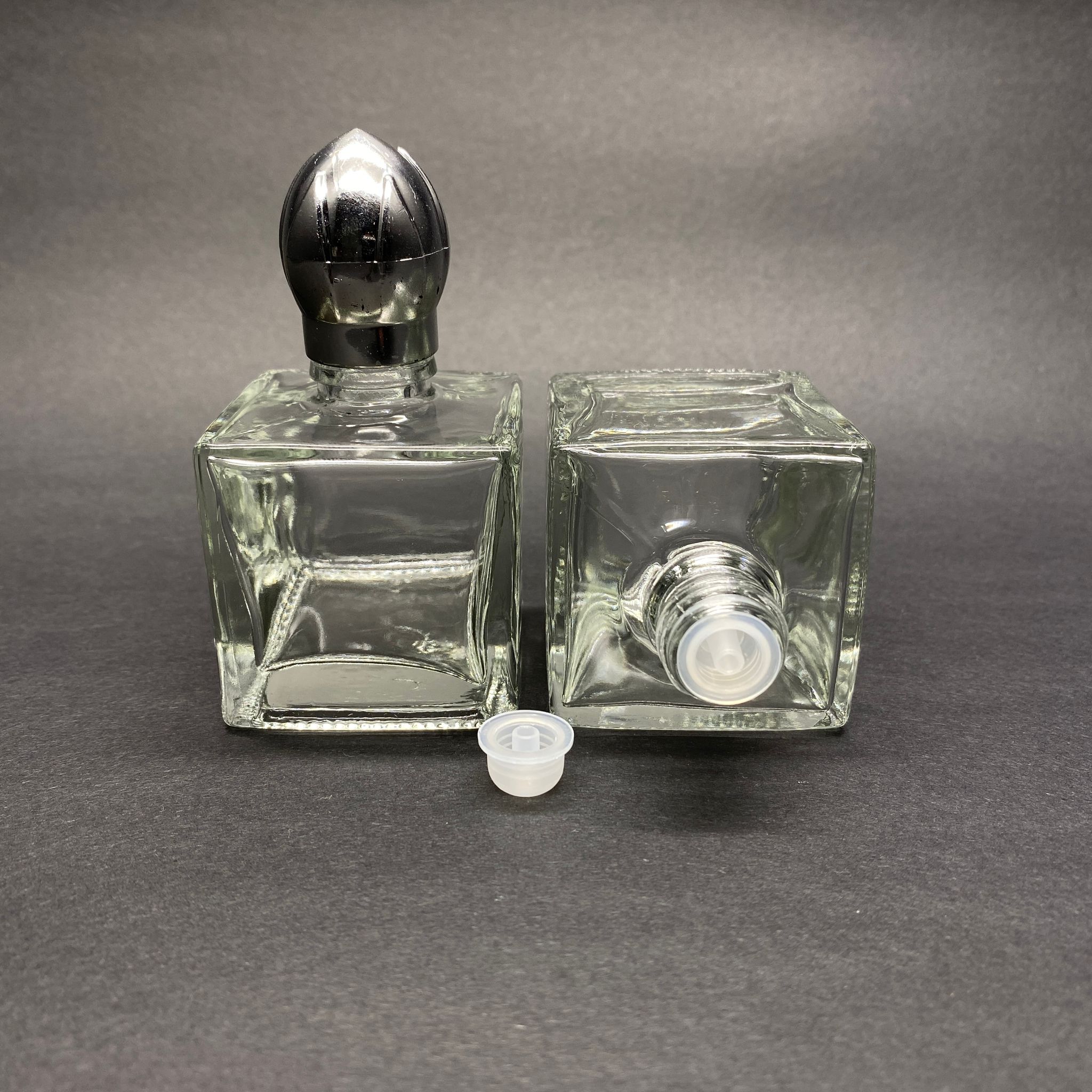 HEDİYELİK CAM KOLONYA ŞİŞESİ - 50 ML KARE ŞİŞE + GÜMÜŞ METAL KAPAK + KOLONYA TIPALI TAKIM