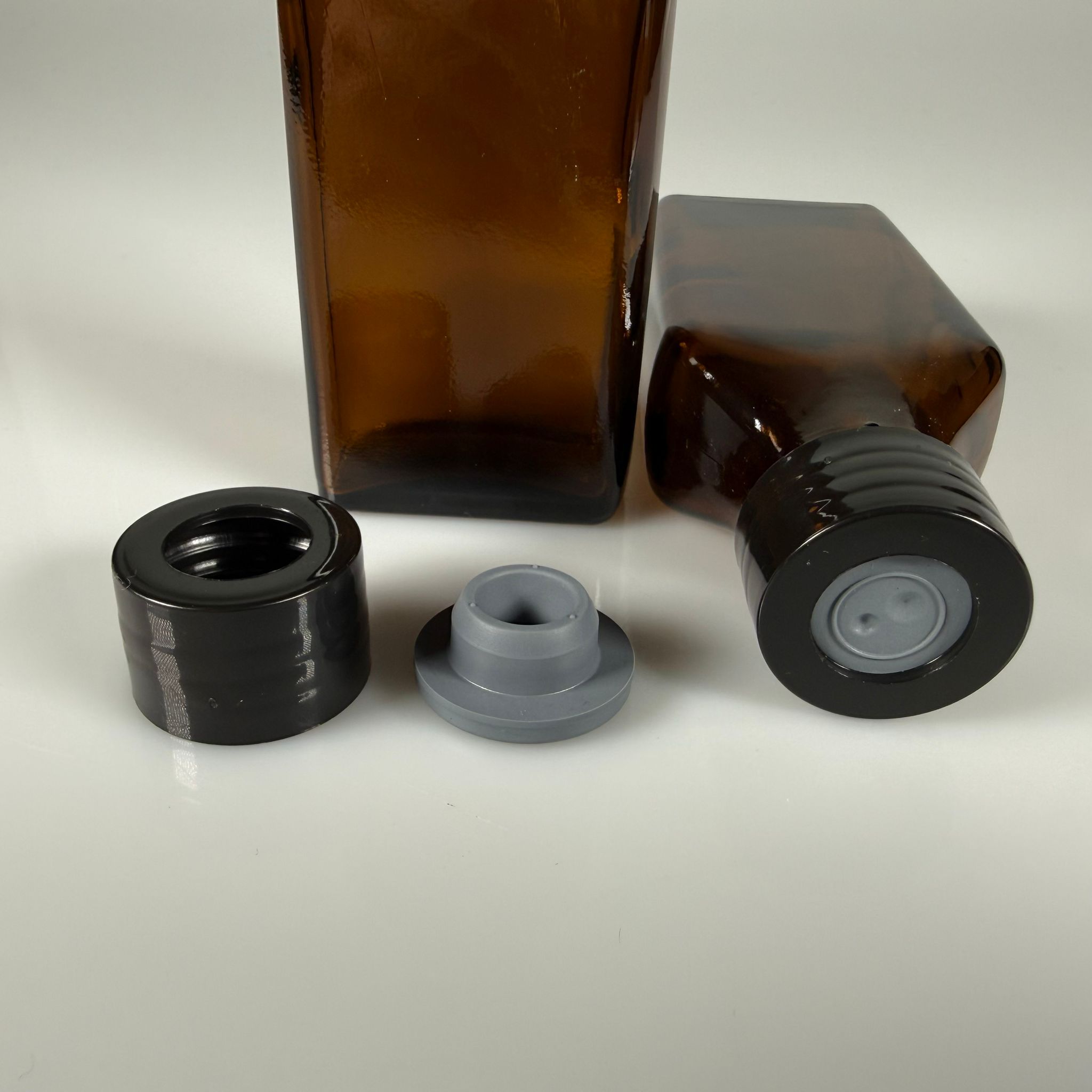 FLAKON ENJEKTÖR SERUM ŞİŞESİ - 100 ML YASSI AMBER ECZA CAM ŞİŞE + VİDALI DELİKLİ KAPAK (ELLE ÇEVİREREK KAPANIR) + KAUÇUK BUTİL TIPA TAKIM