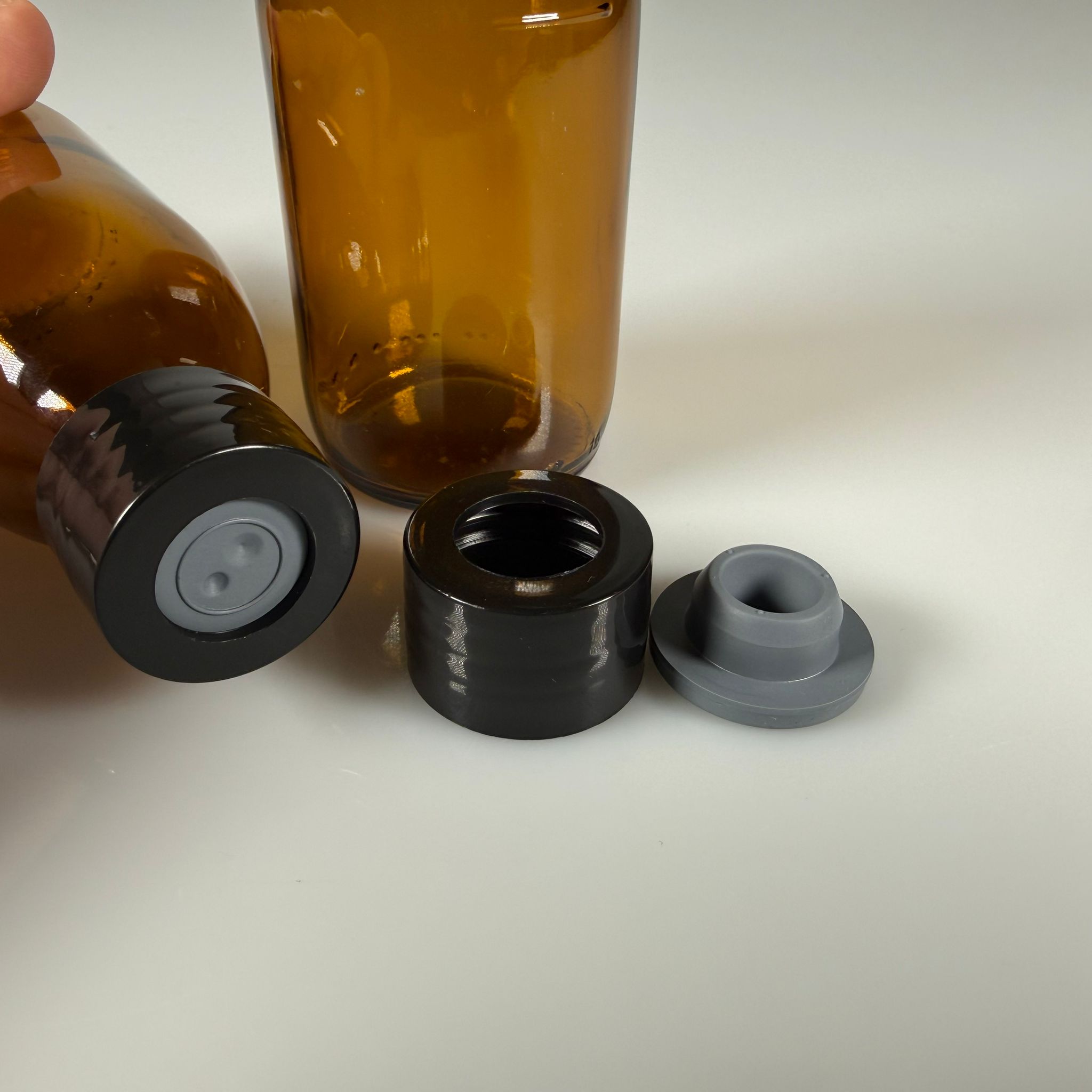 FLAKON ENJEKTÖR SERUM ŞİŞESİ - 125 ML AMBER ECZA CAM ŞİŞE + VİDALI DELİKLİ KAPAK (ELLE ÇEVİREREK KAPANIR) + KAUÇUK BUTİL TIPA TAKIM